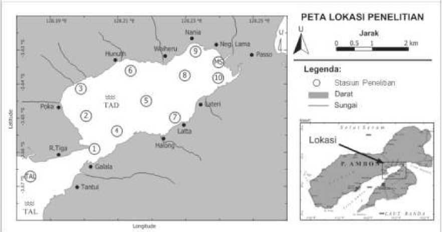Penelitian ini dilaksanakan di perairan Teluk Ambon Dalam, Pulau Ambon, Provinsi Maluku. Secara geografis berada pada posisi 128p 19’4.03"-128024’33"BT dan -03.66p 39’29"- 03.63030’30"S (Gambar 1). Penelitian ini dilaksanakan dari Juni 2011 sampai dengan Mei 2012, mewakili ke empat musim (Musim Timur,Musim Peralihan II, Musim Barat dan Musim Peralihan I). Musim Timur berlangsung dari bulan Juni – Agustus, musim peralihan II dari bulan September- Nopember, musim barat dari bulan Desember- Pebruari dan musim peralihan I dari bulan Maret- Mei. Penelitian ini berlangsung dalam dua belas (12) kali sampling dengan interval waktu setiap satu bulan di dua belas (12) stasiun.