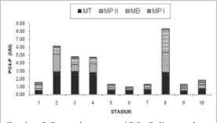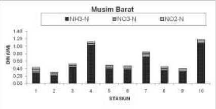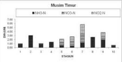 Gambar 4 memperlihatkan bahwa pada Musim Timur, di zona I (St 1, St 2, St 3 dan St 4) dan zona III (St 8, St 9 dan St 10) didominasi oleh amonia (> 50%), komposisi DIN didominasi oleh amonia yang tinggi dapat merupakan indikasi dari intensifnya proses denitrifikasi dan adanya pencemaran bahan organik yang berasal dari limbah domestik, industri, dan limpasan (run-off) pupuk pertanian (Effendi H. 2003). sedangkan di zona II (St 5, St 6 dan St 7) terdapat konsentrasi nitrat dan nitrit yang tinggi. Nitrat berkorelasi dengan oksigen terlarut (Pearson’s r = -0.634;P<0.05), karena konsentrasi oksigen yang tinggi di perairan, maka terjadi oksidasi amonia