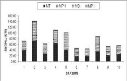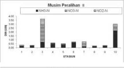 Pada musim peralihan II terdapat peningkatan yang menyolok di stasiun 3, konsentrasi nitrat 59.72%, tingginya konsentrasi nitrat di stasiun ini disebabkan oleh nitrat dan nitrit berkorelasi dengan turbiditas berturut-turut (Pearson’s r = 0.842; r = 0.808; P<0.01). Turbiditas yang tinggi disebabkan oleh dekomposisi bahan organik. Pada stasiun 10 terdapat amonia dengan konsentrasi 72.06%. (Gambar 4), tingginya amonia di stasiun ini disebabkan oleh stasiun 10 berdekatan dengan muara sungai dan rumah penduduk yang padat yang banyak menghasilkan limbah domestik dan limbah industri.