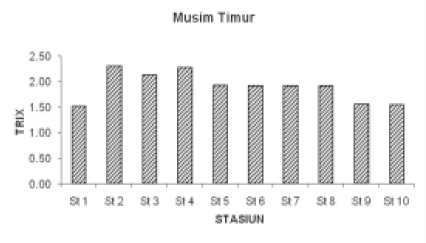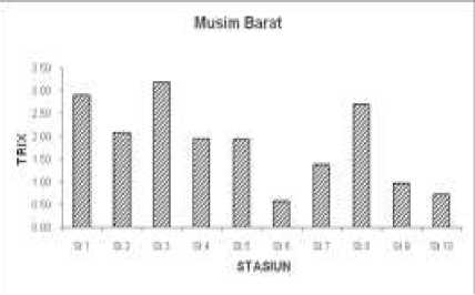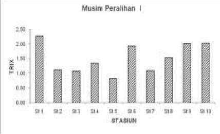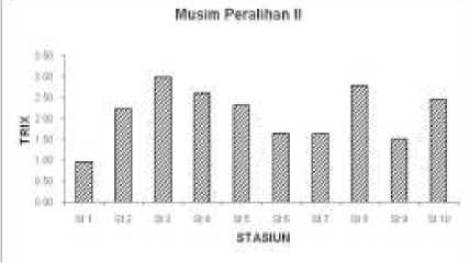 Analisis tropik indeks dilakukan untuk menjelaskan status nutrien pada suatu perairan, perhitungan didasarkan pada nilai minimum dan maksimum dari DIN, PO4, biomassa fitoplankton (klorofil-a) dan oksigen saturasi. Pada Musim Timur, Musim Peralihan II, Musim Barat dan Musim Peralihan I nilai tropik indeks berturut-turut berkisar dari 1.52 sampai 2.30 (1.90±0.29); 0.97 sampai 3.01 (2.13±0.65); 0.58 sampai 3.20 (1.85±0.92) dan 0.83 sampai 2.28 (1.53±0.50)) (Gambar 7 dan 8). Rata-rata nilai tropik indeks lebih pada musim Peralihan I. Rendahnya rata-rata nilai tropik indeks pada musim Peralihan I disebabkan karena pengaruh rata-rata DIP