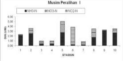 Konsentrasi amonia pada Musim Peralihan I > 50% pada stasiun 1, 2, 5, 9 dan stasiun 10. Konsentrasi amonia yang tinggi disebabkan oleh suhu perairan yang masih tinggi 29.78 -30.36oC (30.14±0.18) yang mempengaruhi dekomposisi bahan organik. Sedangkan pada stasiun 5 terdapat konsentrasi nitrat yang tinggi yaitu 1.66 µM (32.96%), bila dibandingkan dengan Teluk Jakarta pada musim yang sama konsentrasi nitrat yang tinggi 13.95 µM (Damar, 2003), maka Teluk Ambon Dalam terdapat konsentrasi nitrat yang rendah. Pada stasiun 6 terdapat konsentrasi nitrit yang tinggi yaitu 3.11 µM (80.68%)(Gambar 4) disebabkan oleh limbah industri dari kapal-kapal ikan yang berlabu di pesisir pantai , dibandingkan dengan Teluk Jakarta konsentrasi nitrit yang tingg 5.13 µM (Damar 2003) maka Teluk Ambon masih dalam katagori rendah