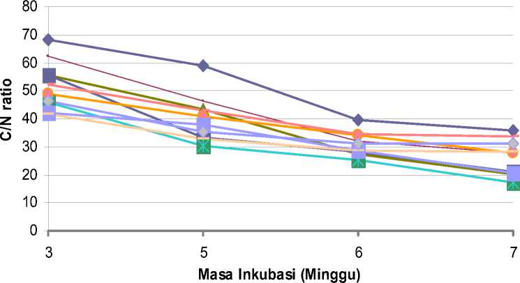 Setelah inkubasi 5 minggu, C/N rasio kompos nampak sudah mengalami penurunan yang berarti. Penurunan nilai C/N rasio yang cukup tajam terjadi setelah inkubasi berlangsung selama 7 minggu, utamanya pada formulasi perlakuan yang mengandung sampah organik pasar yang