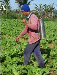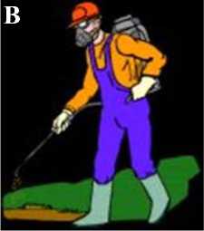 Gambar 1. A. Menyemprot tanpa memperhatikan alat pelindung diri (APD) dan arah menyemprot, B. APD yang lengkap untuk menyemprot