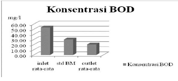 Berdasarkan pengolahan data dari uji laboratorium terhadap sampel hasil olahan IPAL RSUD W. Z. Yohanes Kupang dari tahun 2011hingga tahun 2013 diketahui bahwa nilai BOD sebelum dan sesudah pengolahan mengalami penurunan. Sebelum dilakukan perhitungan efisiensi, setidaknya dapat diketahui bahwa IPAL dapat menurunkan parameter BOD. Rata-rata inlet BOD adalah sebesar 53.61 mg/l atau dibulatkan menjadi54 mg/l dimana jumlah tersebut berada jauh lebih tinggi daripada standar baku mutu yang telah ditetapkan oleh pemerintah sebesar 30 mg/l (Lampiran 5). Setelah dilakukan pengolahan, konsentrasi BOD rata-rata turun menjadi 20.36 mg/l. Penurunan tersebut secara nyata menempatkan pada posisi di bawah standar baku mutu atau dengan kata lain air limbah dapat dibuang tanpa membahayakan perairan. Secara grafis, perbandingan inlet, standar baku mutu dan outlet BOD dapat dilihat di Gambar 1.