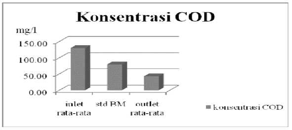 Penurunan yang terjadi pada parameter COD melebihi apa yang ada pada parameter BOD. Rata-rata inlet COD sebesar 129.58 mg/l. Standar baku mutu yang diberlakukan untuk parameter COD tidak seketat BOD. Besar standar baku mutu untuk CODadalah 80 mg/l. Berdasarkan data outlet yang ada di RSUD W. Z. Yohanes Kupang, didapat perhitungan rata-rata outlet sebesar 42.72