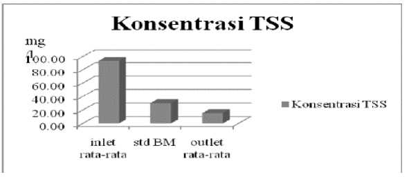 Parameter ketiga yang dinilai dalam penelitian ini adalah TSS. Rata-rata inlet TSS dari limbah RSUD W. Z. Yohanes Kupang adalah 93.33 mg/l. setelah dilakukan pengolahan, besar konsentrasi rata-rata TSS adalah 15.31 mg/l. Nilai tersebut berada di bawah standar baku mutu yang