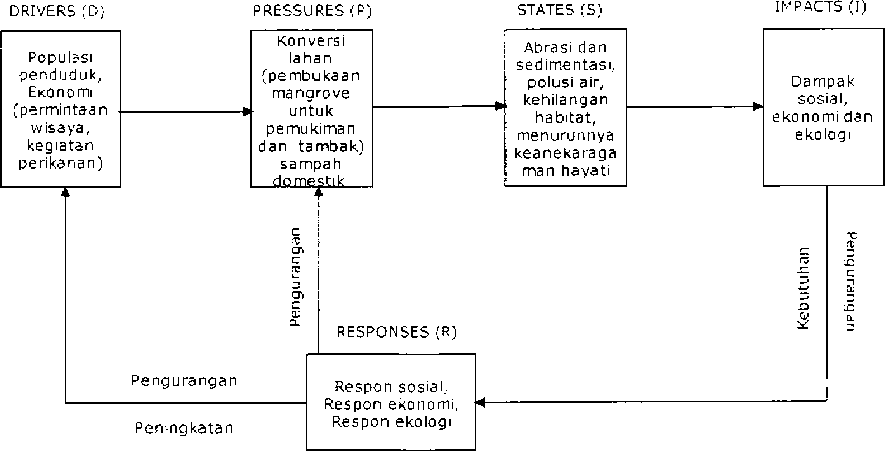 status yang menggambarkan kondisi sistem dan tipe maupun karakteristik secara fisik, kimiawi, dan biologi. Impact merupakan akibat tekanan pada kondisi ekosistem, kesehatan masyarakat dan kondisi kehidupan atau dengan kata lain bagaimana kondisi perubahan ekosistem yang diakibatkan hasil aplikasi tekanan yang terjadi (Mattei, 2007). Response adalah berbagai tindakan yang dilakukan oleh masyarakat baik individual maupun secara kolektif untuk mengatasi dampak lingkungan, mengoreksi kerusakan yang ada atau mengkonservasi sumber daya alam, meliputi penetapan peraturan, pengeluaran biaya penelitian, pendapat masyarakat dan preferensi konsumen, perubahan strategi manajemen dan lain-lain (Pinter et al., 1999).