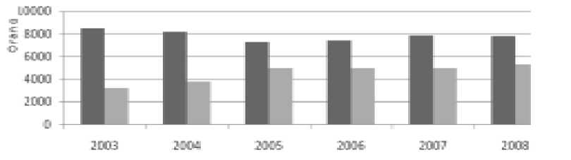 Gambar 2. Jumlah penduduk berdasarkan kelompok umur Produktif ( ) dan Non Produktif ( ■) Tahun 2003 – 2008 di Kecamatan Una-Una