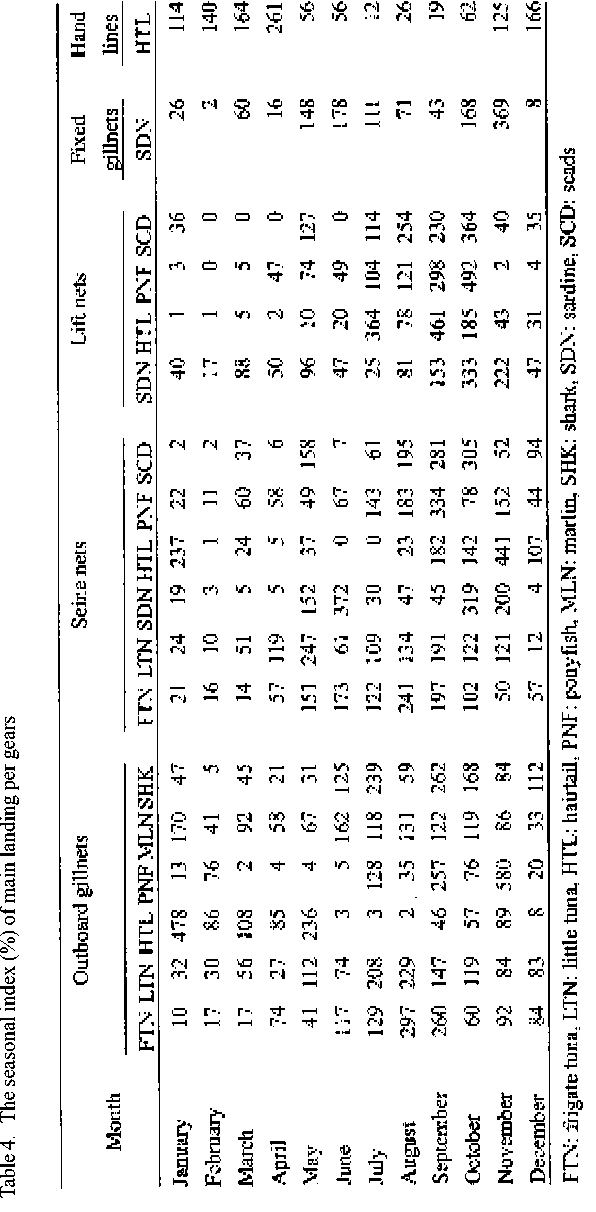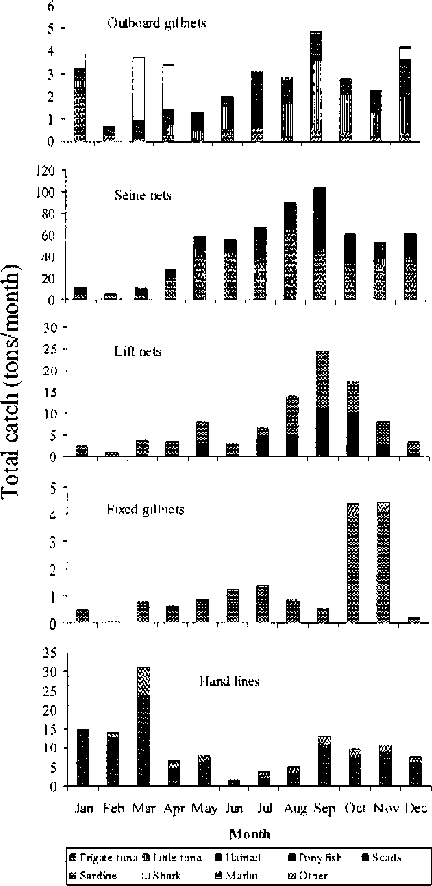 The main species composition of seine nets was frigate tuna (45.2 %), little tuna (10.1 %), sardine (0.4 %), hairtail (4 %), ponyfish (21.5 %) and scad (18.8 %). On the other hand the main species composition of outboard gillnets was frigate tuna (35.2 %), little tuna (25.5 %), scad (1.1 %), hairtail (2.1 %), ponyfish (3.9%) and marlin (12.9%) while lift nets is sardine (66.7 %), hairtail (7.5 %), ponyfish (16.2 %) and scad (9.5 %). Except for hand lines and fixed gillnets, landing composition of gears varied among months, and were dependent on species abundance.