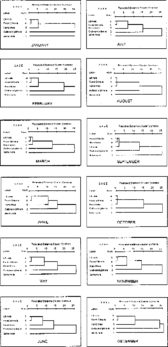 The similarities in target species were described by using the cluster analysis. We computed the monthly species composition similarity patterns among gears, based on the Z-score transformed of monthly species landing compositions data (in average catch per trips) (SPSS, Chicago, IL, USA). If the gears clustered into one group, it means that the gears have a similar target species. On the contrary, if gears fall outside of the group it means that the gears are not targeting the same species. The distinctive landing similarity patterns between months were described by hierarchical clustering analysis based on the centroid and squared euclidean distance interval methods (van Tongeren 1995).