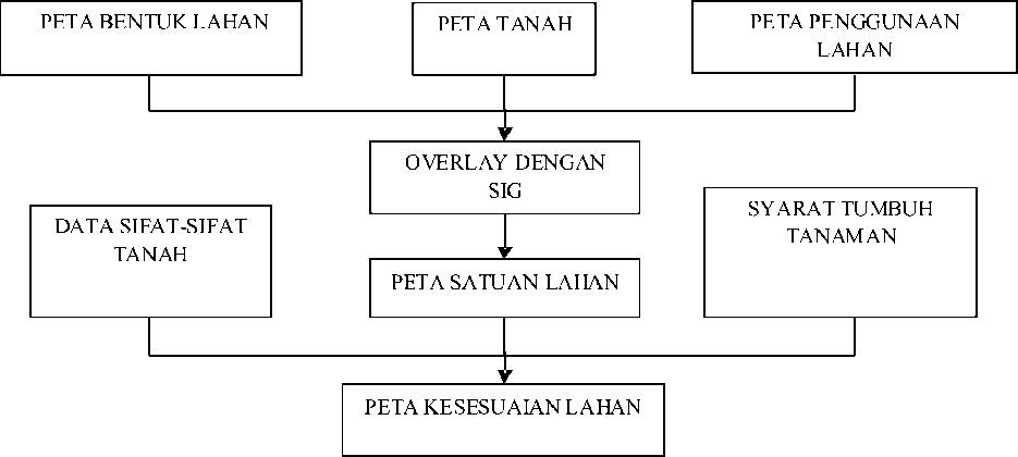 Pemetaan kesesuaian lahan dilakukan dengan unit analisis satuan lahan. Peta satuan lahan disusun dengan melakukan tumpangsusun (overlay) peta bentuk lahan, peta tanah dan peta penggunaan lahan (Gambar 1) yang kesemuanya memiliki skala 1: 50.000. Overlay dilakukan dengan sistem informasi geografis (SIG).