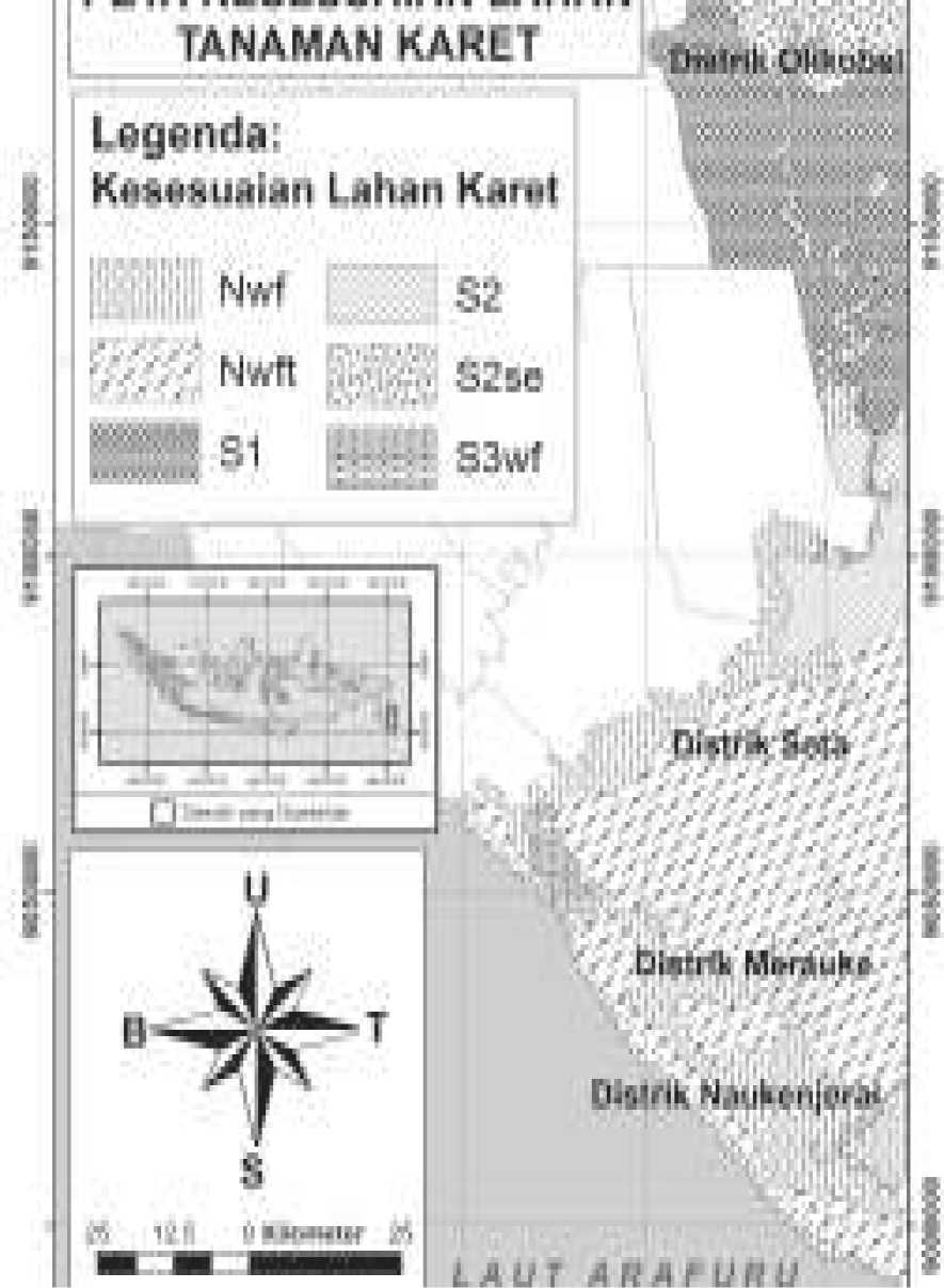 Penelitian ini bertujuan untuk melakukan pemetaan kesesuaian lahan kualitatif skala tinjau (1:250.000) untuk tanaman karet dan padi. Wilayah kajian terletak di wilayah perbatasan Kabupaten Merauke Provinsi Papua yang meliputi empat distrik yang meliputi Kecamatan Olikobel, Kecamatan Merauke, Kecamatan Sota dan Kecamatan Naukenjerai.