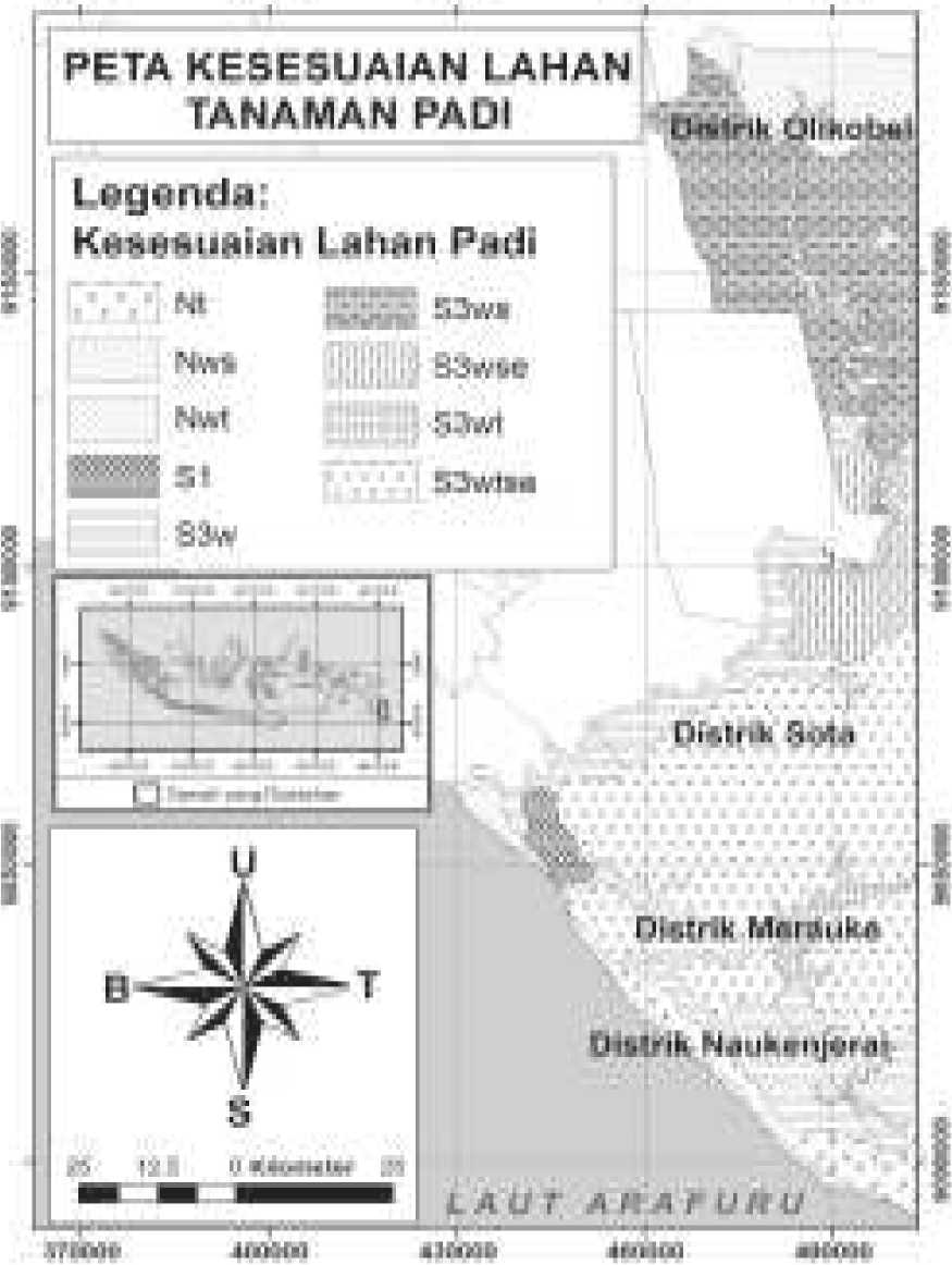Hasil analisis terhadap peta kesesuaian lahan untuk tanaman padi menunjukkan bahwa pada wilayah penelitian terdiri dari 9 sub kelas, yaitu S1, S3w, S3wt, S3ws, S3wse, S3wtse, Nt, Nws dan Nwt. Kesesuaian lahan dengan kelas sangat sesuai (S1) hanya terdapat di Kecamatan Merauke dengan luas lahan sebesar 9.948,52 hektar, sedangkan lahan yang lain hanya memiliki kesesuaian lahan agak sesuai (S3) dan tidak sesuai (N) (Gambar 3). Hal ini berarti bahwa jika tidak dilakukan usaha-usaha mengatasi faktor-faktor kendala, maka pengembangan padi di wilayah penelitian hanya dapat dilakukan di Kecamatan Merauke.
