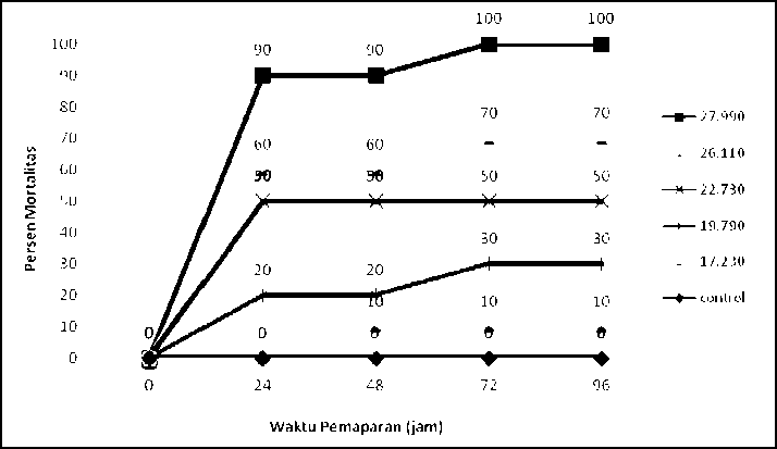Mortalitas Daphnia pada masing-masing konsentrasi media uji bervariasi sejak jam ke-24 sampai jam ke-96 (Gambar 1). Namun yang paling tinggi dan cepat pengaruhnya ialah media uji dengan konsentrasi paling tinggi, yaitu 27.990 ppm. Pada 24 jam pertama, media uji ini telah menyebabkan 90% Daphnia mati. Media uji dengan konsentrasi 19.790 ppm, 22.730 ppm, dan 26.110 ppm masing-masing telah mematikan Daphnia berturut-turut sebesar 20%, 50%, dan 60%. Cepatnya media uji (cuttings) memberikan respon mortalitas bagi Daphnia pada awal pemaparan menandakan relatif tingginya sifat toksik cuttings tersebut.