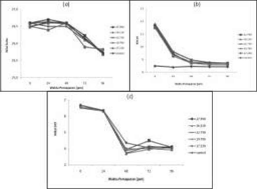 Gambar 2. Karakteristik kualitas air: (a) Suhu (oC), (b) pH, (c) DO (mg/l) selama 96 jam.