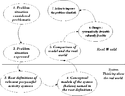 Soft systems methodology (SSNj) adalah proses penelitian sistemik yang menggunakan model-model sistem (Chekland 1993: 26). Pengembanganmodel sistem tersebut dilakukan dengan melakukan penggalian permasalahan yang tidak terstruktur, mendiskusikan secara intensif dengan pihak terkait, membandingkan konsep systems thinking dengan real world, dan melakukan penyelesaian masalah secara bersama.