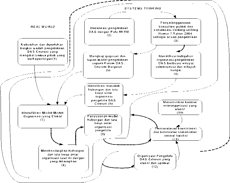Dengan pendekatan kerangka berpikir serbasistem solusi masalah pengorganisasian dilakukan melalui beberapa langkah. Pertama, mengidentifikasi model organisasi pengelolaan Daerah Aliran Sungai berdasarkan pendekatan pengelolaan Sumber Daya Air terpadu (integrated water resources management). Langkah ini dilakukan dengan menyelenggarakan suatu kegiatan, yaitu : (1) pengkajian dan konsultasi publik atas Undang-Undang Nomor 7 Tahun 2004 tentang Sumber DayaAir (2) pengkajian undang-undang lain yang relevan sebagai acuan penyelenggaraan pengelolaan (3) melakukan inventarisasi dan identifikasi stakeholder yang saat ini mengelola DAS
