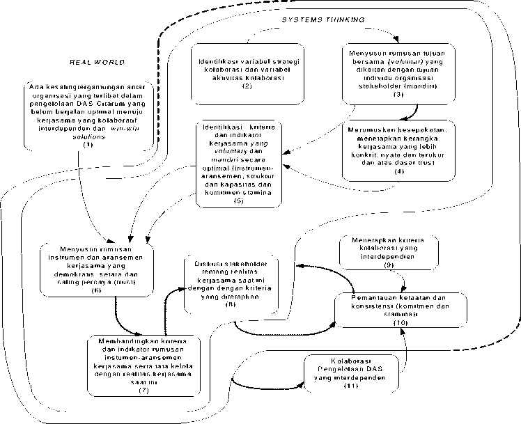 Consistent with technical and organizational problems above, watershed management based on space planning or government autonomy tended to be unoptimal, because it was not pararell with nature, characteristics of river flow (hidrologically), nor administrative or technical boundaries. In this condition, a newframe of watershed management needed, which had systemics frames, based on systemtematic thinking. One of tools of analysis which could be applaid was soft systems methodology (SSM).