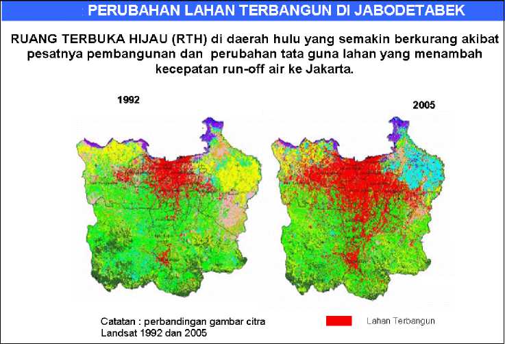 - 2005, kondisi tersebut meliputi juga lahan terbangun di Jabodetabek. Seperti diketahui, lahan terbangun merupakan ulah manusia yang membangun dan menciptakan karya arsitekturnya. Keadaan ini sudah sangat memperlihatkan bahwa pemrakarsa pembangunan wujud arsitektur, termasuk di dalamnya para arsitek, warga masyarakat pemberi tugas, para pengambil keputusan pemerintah kota. Mereka merupakan pemberi kontribusi yang sangat besar terhadap kondisi lahan terbangun. Hal ini disebabkan karena pada daerah lahan terbangun ini terdapat banyak perkerasan pada bangunan dan perkerasan lahan di luar bangunan, sehingga kekurangan daerah resapan untuk menampung curah air hujan (gambar 9 ). Terbatasnya resapan disertai tersumbatnya (kurangnya pemeliharaan) pada saluran-saluran air kota, menyebabkan banjir besar yang mengganggu kehidupan warga.
