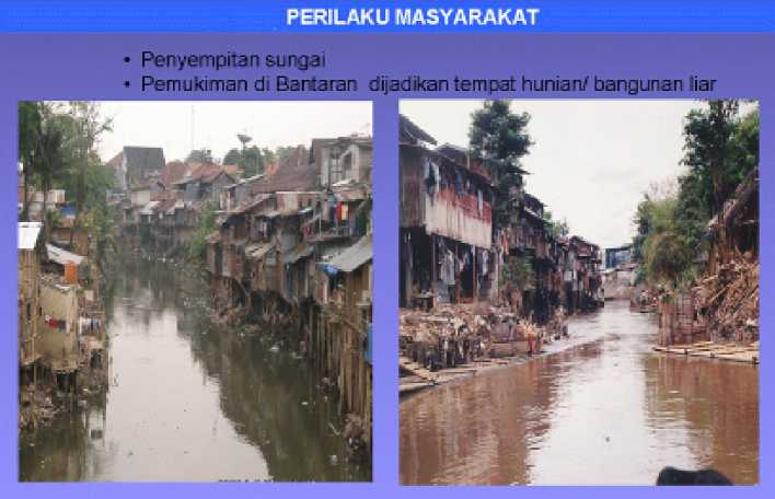 8. Perilaku masyarakat. Penyempitan sungai karena bantaran sungai dijadikan hunian.
