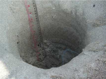 Gambar 2. Gambar Telur Penyu Hijau yang dimasukkan kedalam lubang sarang buatan. (Foto. Sukada, 6)
