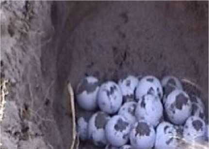 Lubang sarang dengan diameter 40 x 60 cm dengan jarak lubang satu dengan lubang yang lainnya berjarak 15 cm, diisi telur bertumpuk melingkar berbentuk piramid sehingga setelah
