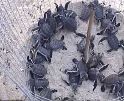 Gambar 4. Gambar Sekelompok Tukik yang baru menetas dan keluar dari lubang sarang (Foto. Sukada,2006)