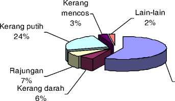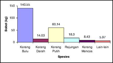 Berdasarkan hasil survei selama bulan November diperoleh hasil bahwa kerang bulu (Anadara antiquata) memberikan kontribusi terbesar (58%) dari total hasil tangkapan yang didapatkan. Hasil tangkapan berikutnya yang cukup dominan adalah kerang putih (Anadara sp.) dengan kontribusi 24 %, rajungan (Portunus sp.) 7 %, kerang darah (Anadara granosa) 6 %, dan kerang mencos (Anadara indica) 3 % dari bobot total hasil tangkapan (Gambar 2). Hasil tangkapan lainnya adalah udang putih (Penaeus merguensis), sotong (Sepia sp.), keong macan (Babylonia spirata), dan kerang hijau (Perna viridis) yang berkontribusi 2 % dari total hasil tangkapan.