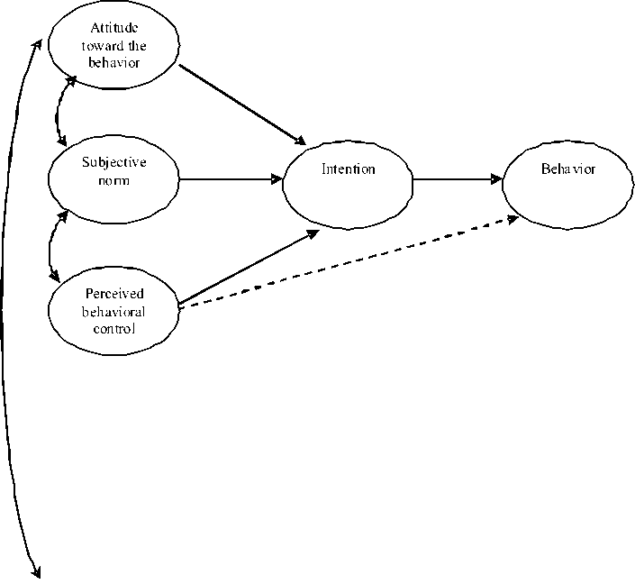 Peramalan perilaku berdasarkan theory of planned behavior, Ajzen (2006) menyatakan bahwa sikap yang mengarah pada perilaku memperlihatkan tingkatan ketika seseorang mengevaluasi perilaku tertentu apakah hal tersebut dianggap baik atau buruk, norma subyektif adalah faktor sosial yang memperlihatkan tekanan sosial yang dirasakan untuk melakukan ataupun tidak melakukan suatu tindakan/ perilaku, sedangkan kontrol perilaku yang dirasakan yaitu variabel yang menggambarkan tingkatan sulit atau mudahnya melakukan suatu tindakan yang dianggap sebagai cerminan pengalaman sebelumnya. Lebih lanjut dikatakan bahwa tindakan seseorang dikendalikan oleh tiga hal yaitu keyakinan tentang kemungkinan keluaran dari perilaku dan evaluasi terhadap keluaran tersebut (behavioral beliefs), keyakinan tentang harapan normatif orang lain dan motivasi untuk memenuhi harapan tersebut (normative beliefs), dan keyakinan tentang adanya faktor yang mungkin memfasilitasi atau menghalangi kinerja perilaku dan kekuatan yang dirasakan dari faktor-faktor tersebut (control beliefs).