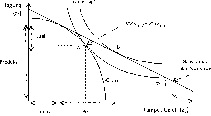 Gambar 1 menunjukkan solusi sederhana untuk masalah maksimisasi produksi sapi dengan kendala ketersediaan input-input yang digunakan dalam memproduksi rumput gajah dan jagung untuk mencapai titik di mana isokuan untuk produksi sapi bersinggungan dengan fungsi transformasi produk, yaitu di titik A. Namun, dengan menjual sebagian jagung dan membeli sejumlah rumput gajah, memungkinkan petani memproduksi sapi lebih banyak, yaitu pada titik persinggungan antara isokuan sapi dan garis isorevenue (titik B), daripada keputusan produksi di titik A. Garis isorevenue untuk produksi rumput gajah dan jagung merupakan garis isocost untuk produksi sapi (Debertin, 1986).