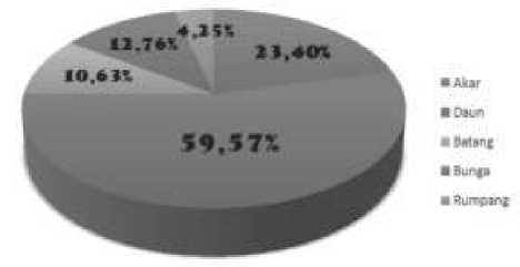 Berdasarkan diagram lingkaran tersebut di atas maka dapat diketahui organ daun yang paling dominan digunakan untuk menyembuhkan penyakit gangguan saluran kencing (59,57%), kemudian baru akar (23,40%), bunga (12,76%), batang (10,63%), dan rimpang (4,25%). Di duga secara alami kandungan alkaloid berkhasiat obat kebanyakan terakumulasi di daun.