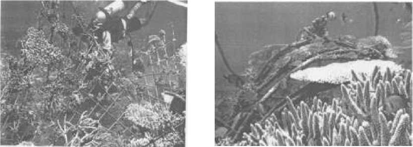 Gambar 1 Kerangka besi yang ditancapkan di dasar laut sebagai media tanam bagi pemulihan terumbu karang yang mengalami kerusakan. Media tanam ini setiap saat dikontrol oleh petugas agar pertumbuhannya tidak terganggu. Gambar kanan menunjukkan terumbu karang berkembang secara baik (Dokumentasi Atmadja, 2009).
