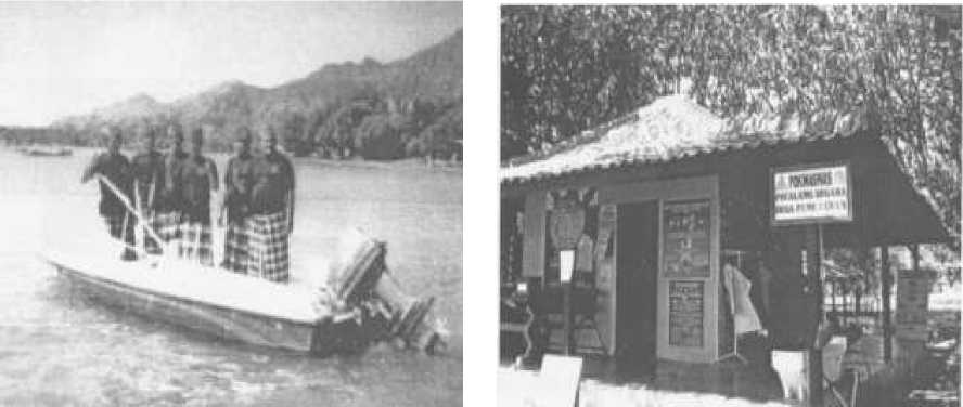Gambar 2. Pecalang segara berdiri di atas perahu bermesin sedang berpatroli berkapaian dinas pecalang. Gambar kanan kantor POKMASWAS yang berfungsi pula sebagai pusat pelayanan wisatawan (Dokumentasi Atmadja, 2009).