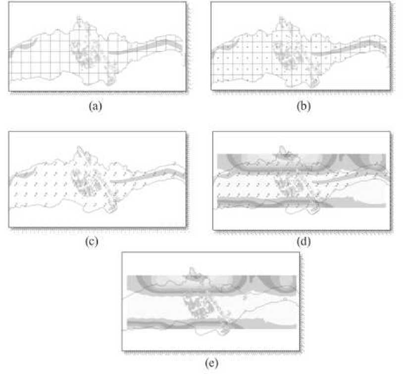 (b) Menentukan titik pengambilan sampel ketinggian banjir lahar. (c) Menampilkan ketinggian endapan banjir lahar. (d) Interpolasi ketinggian endapan banjir lahar. (e) Sampel rumah yang disurvey sesuai ketinggian endapan banjir lahar.