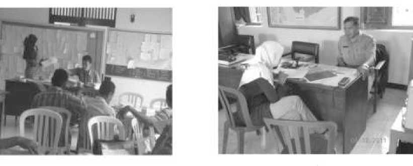Gambar 2.4. Kegiatan FGD dan Wawancara. (a) FGD di Kecamatan Salam. (b) Wawancara dengan Aparat Pemerintah Desa Salam Kecamatan Salam (Foto : Rosalina Kumalawati, 2012)