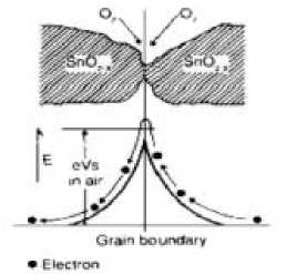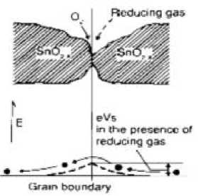 Ketika bahan sensitif (SnO2) dihangatkan pada suhu tertentu, oksigen akan diserap pada permukaan kristal dan oksigen akan bermuatan negatif. Hal ini disebabkan karena permukaan kristal mendonorkan elektron pada oksigen yang terdapat pada lapisan luar, sehingga oksigen akan bermuatan negatif dan muatan positif akan terbentuk pada permukaan luar kristal. Tegangan permukaan yang terbentuk akan menghambat laju aliran elektron seperti tampak pada ilustrasi Gambar 2.2.