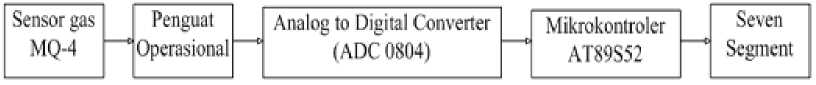 Alur respon sinyal yang ditunjukkan pada Gambar 3.1 dimulai dari sensor MQ-4 yang mengubah sinyal masukan berupa kadar gas hidrokarbon menjadi sinyal analog berupa tegangan. Jika perubahan tegangan keluaran yang dihasilkan oleh sensor relatif kecil, maka digunakan rangkaian penguat opersional agar perubahan tegangan keluaran sensor dapat dibaca oleh ADC untuk melakukan konversi sinyal analog menjadi data digital. Data digital yang diperoleh