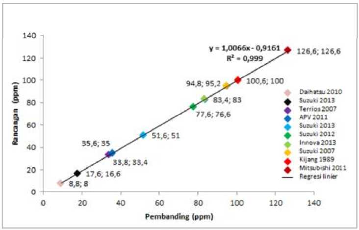 Gambar 4.2 menunjukkan grafik kelinieran antara rata-rata hasil pengukuran kadar gas HC pada 10 kendaraan roda 4 berbahan bakar premium oleh alat rancangan dan alat pembanding. Koefisien determinasi (R2) yang diperoleh dari hasil analisa data pengujian alat rancangan yaitu sebesar 0,999. Koefisien tersebut menyatakan bahwa kesesuaian alat rancangan dengan alat pembanding adalah sebesar 99,9%, sedangkan sisanya terjadi ketidaksesuaian. Ketidaksesuaian yang terjadi pada hasil pengukuran mungkin disebabkan oleh sistem penampungan gas HC yang diukur dan sensitivitas sensor dari alat rancangan