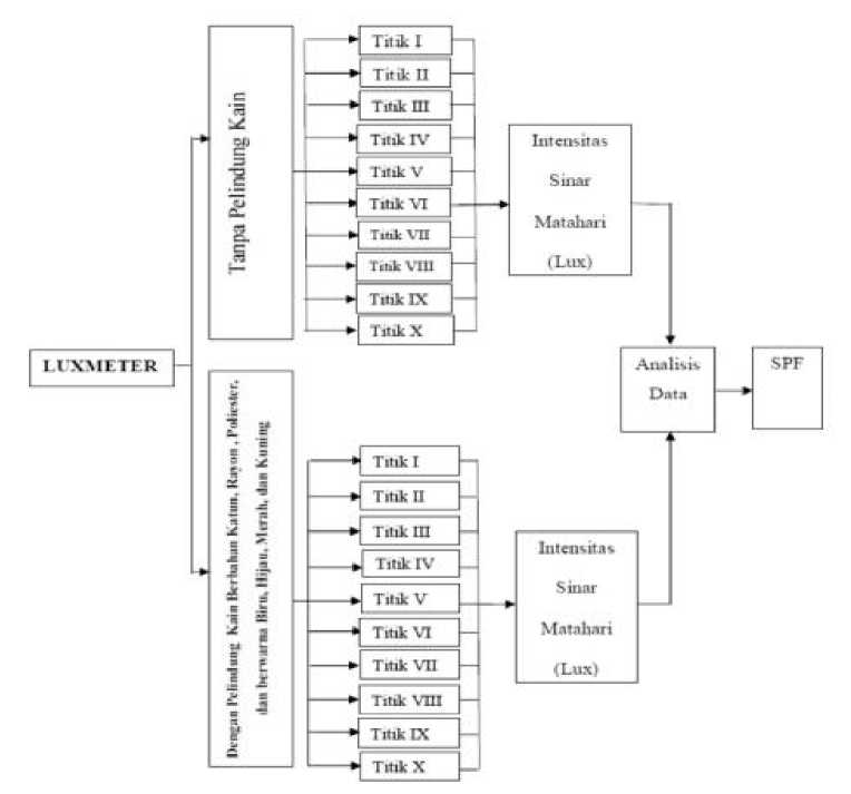 Untuk menentukan nilai sun protection factor (SPF) dari masing-masing kain yaitu dengan membandingkan intensitas sinar matahari tanpa pelindung kain (lux) dan intensitas sinar matahari dengan pelindung kain (lux). Adapun jenis kain yang digunakan yaitu kain katun, rayon, dan poliester berwarna biru, hijau, merah dan kuning. Data intensitas sinar matahari diambil dari rentang jam 10-11 hingga rentang jam 16-17 WITA dengan lima kali pengamatan. Skema penelitian dapat dilihat pada Gambar 3.1 berikut.