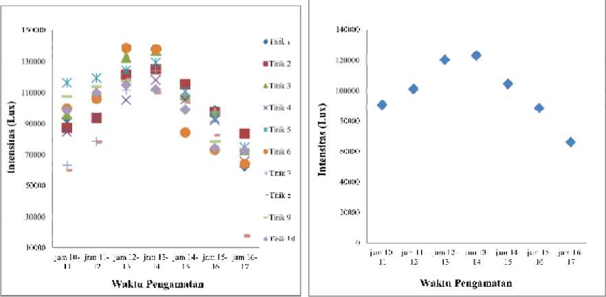 1. Intensitas sinar matahari dari rentang jam 10-17 WITA berkisar dari 59.760 lux hingga 138.660 lux.