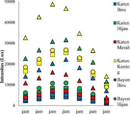 bentuk. Terjadi peningkatan dari rentang jam 11-12 WITA hingga rentang jam 13-14 WITA. Namun pada kain rayon biru, rayon merah, poliester merah dan poliester kuning