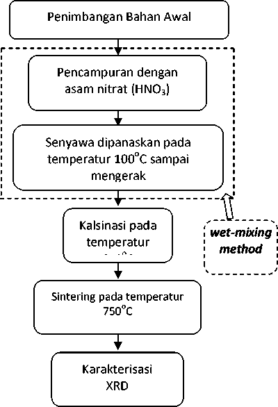 Bahan awal ditimbang dengan menggunakan neraca elektronik sesuai dengan perhitungan stoikiometri zat tersebut. Selanjutnya masing-masing bahan awal dilarutkan dengan asam nitrat HNO3 dan dilakukan pengadukan selama 3 jam. Kemudian semua bahan awal dicampur menjadi satu dan dilakukan pengadukan kembali selama 24 jam dan selanjutnya dipanaskan pada temperatur 100oC sampai mengerak. Senyawa berupa kerak dikalsinasi dengan menggunakan furnace pada temperatur 650oC selama 3 jam. Senyawa hasil kalsinasi disintering pada temperatur 750oC, 850oC, dan 950oC selama 1 jam. Sampel yang sudah berhasil disintesis dikarakterisasi dengan XRD, kemudian dilakukan search match (pencocokan puncak difraksi)