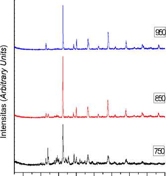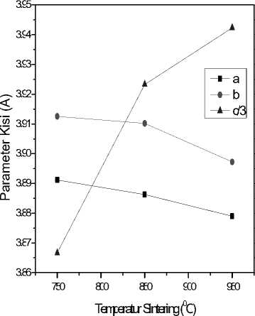 sintering pada 750oC, 850oC, dan 950oC diperoleh a masing-masing 3.891178 Å, 3.886266 Å, dan 3.879036 Å, b masing-masing 3.912534 Å, 3.910184 Å, dan c masing-masing 11.600093 Å, 11.769890 Å, dan 11.826884 Å.