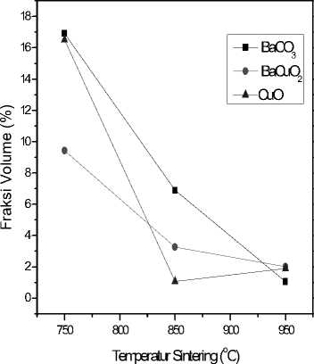 Hasil perhitungan memperlihatkan penambahan persentase fasa superkonduktor dengan penambahan temperatur sintering, sebaliknya persentase fraksi volume impuritas menurun dengan meningkatnya temperatur sintering. Pada penelitian ini, persentase fraksi volume tertinggi diperoleh sebesar 95.04%. Hal tersebut mengindikasikan masih terdapat fasa impuritas dalam jumlah kecil, sehingga diperlukan sintering yang lebih lama.