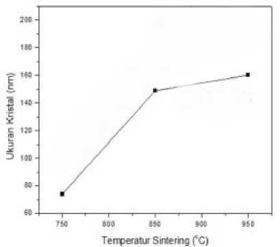 sehingga ukuran kristal bertambah besar. Hasil perhitungan ukuran kristal untuk sampel yang disintering pada temperatur 750oC, 850oC, dan 950oC diperoleh 73 nm, 149 nm, dan 160 nm.