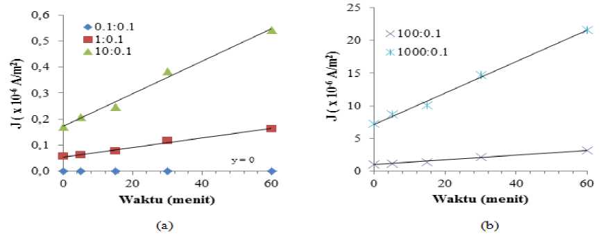 Gambar 4.3 Grafik antara rapat arus difusi ion dengan waktu paparan radiasi UV-C untuk membran kitosan 3%: (a) konsentrasi 0,1 mM : 0,1 mM, 1 mM : 0,1 mM dan 10 mM : 0,1 mM, dan (b) konsentrasi 100 mM : 0,1 mM dan 1000 mM : 0,1 mM.
