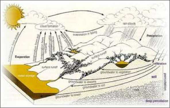 Energi matahari yang merupakan penggerak utama dari siklus. Panas matahari membuat air yang ada di muka bumi menguap (evaporasi), ketika uap air berkumpul terjadi proses kondensasi sehingga terbentuklah awan, dengan batuan angin awan kecil berkumpul menjadi awan besar. Ketika awan tersebut sudah tidak mampu menahan air maka akan jatuh dan terjadi hujan (presipitasi), seperti tampak pada Gambar 1 [6].