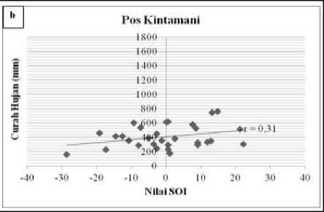 Hubungan fluktuasi nilai SOI terhadap curah hujan pada pos Kembangsari cukup kuat pada Bulan Februari dan rendah pada Bulan Agustus, kemudian di pos Kitamani fluktuasi nilai SOI tergolong rendah saat Bulan Februari dan cukup kuat pada Bulan Agustus. Hubungan antara kedua variabel tersebut dapat dilihat dari