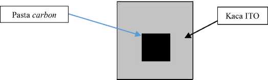 Kaca ITO bagian konduktifnya diberi pembatas berbentuk persegi 1 x 1 cm2 dengan selotip ketebalan 50 µm. Pasta carbon diteteskan di atas kaca ITO, kemudian dilakukan slip casting dengan menggunakan mortir/penggilingan yang berupa spatula yang hasilnya ditunjukkan pada Gambar 2.