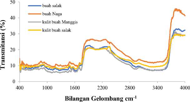 Gambar 4. Spektra FTIR sampel buah salak, kulit buah salak, kulit buah manggis dan buah naga.